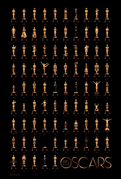 La Academia de las Artes y las Ciencias Cinematográficas ha revelado el cartel oficial diseñado por el artista Olly Moss para la próxima 85 edición de los Premios de la Academia. Diseñado en colaboración con la Gallery1988, el cartel está inspirado en las 85 diferentes estatuillas de las ganadoras a Mejor Película desde 1927 hasta 2012. La gala de los Oscar será el próximo domingo 24 de febrero de 2013 en el Dolby Theatre (antes Kodak Theatre), siendo retransmitida para 225 países en todo el mundo.