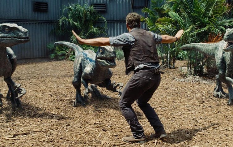 Grant y Malcolm se limitaban a mostrar fascinación al ver dinosaurios redivivos y a huir de ellos usando todas sus habilidades. Grady, en cambio, no solo camina (o conduce) entre ellos: los lidera con sus gestos y su mirada. El espectáculo ya no es ver dinosaurios, sino observar a Chris Pratt adiestrándolos como si fueran perros de presa con los que tiene una conexión especial.