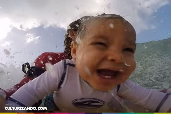 En un principio el bebé se muestra un poco un poco inseguro y con miedo. Pero con el pasar de las olas su confianza va creciendo demostrando gran satisfacción con su sonrisa.