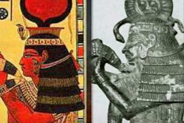 Comparación entre una representación de la diosa Isis (izquierda) con una representación encontrada en la mitológica biblioteca de La Cueva de Los Tayos en Ecuador.