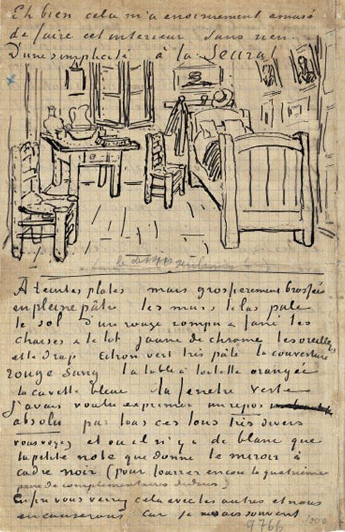 Vincent Van Gogh no solamente desahogaba sus penas con su hermano, sino que también le enviaba bocetos de lo que serían sus próximas pinturas. En las cartas hacía un dibujo detallado de la obra y le explicaba brevemente el concepto de cada una. En la foto se muestra el boceto de una de sus pinturas más famosas: “Un dormitorio en Arlés” de 1888.