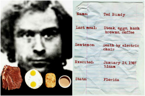 Ted Bundy fue un famoso asesino serial , violador, secuestrador, y necrófilo, quien confesó al menos 30 homicidios entre 1974 y 1978, antes de ser condenado a la silla eléctrica en 1989. Para concluir su vida, Bundy eligió un filete de carne, un par de huevos, hash brown (papas fritas) y un café.