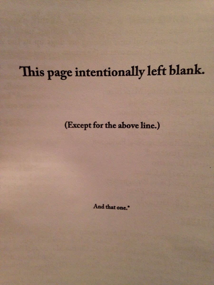 Muchas editoriales utilizan la figura de la página en blanco para darle un respiro a la vista de sus lectores. En ocasiones, para evitar que el usuario piense que el libro tiene alguna falla de impresión, se coloca el mensaje: «esta página fue dejada en blanco intencionalmente».