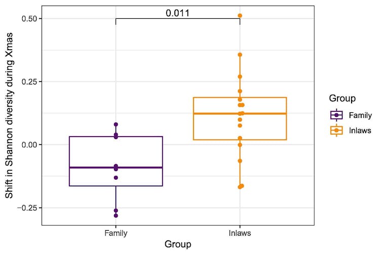 Los resultados demostraron que los participantes que había visitado a sus cuñados tenían cambios significativos en la diversidad de su microbiota fecal. Se identificaron hasta siete especies bacterianas cuya proporción se modificaba según fueran personas que había visitado a sus cuñados o no. En concreto, los que habían visitado a sus cuñados tenían una disminución significativa de todas las especies de Ruminococcus, género bacteriano que se sabe que está asociado a estrés psicológico y depresión.