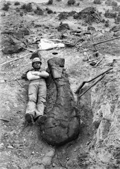 La fascinación por los huesos de dinosaurios empezó a principios del siglo XIX y aún sigue muy viva. Hechizan incluso a quienes los desentierran, de tal manera que no pueden reprimir tumbarse a su lado para fotografiarse con cierto riesgo: las imágenes pueden ser tanto épicas como ridículas.